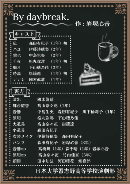 8日・9日に開催される文化祭での公演についてのお知らせです。私たち演劇部は下記の日程で公演いたします。
