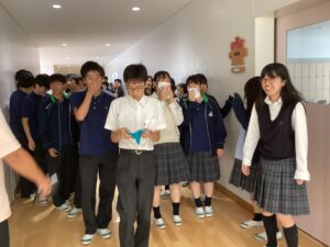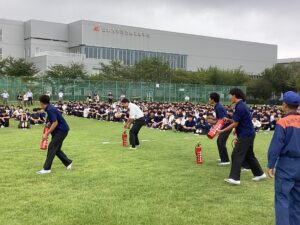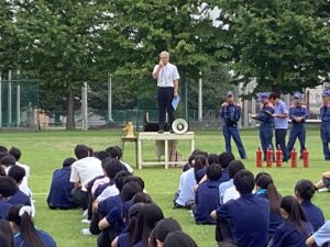 9月10日、火災を想定した避難訓練を実施いたしました。生徒たちはそれぞれ6時間目の授業を受けている教室やグラウンド、体育館などから、担当教員の指示で迅速に避難場所へ移動することができました。避難場所である大学グラウンドに集合したのち、校長先生や消防署の職員の方に講評をいただき、選出された生徒による消火器訓練を行いました。1学期には地震を想定した避難訓練を実施しましたが、地震と火災では、避難の仕方や気を付けなければいけないことが異なります。いざというときのために、今日の体験を胸に刻んでおいてください。