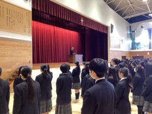 式辞として、五味学校長は全日本大学駅伝での日本大学の活躍に触れ、この数年の選手たちの意識改革の中で、何をするかだけでなく、何をしないかという行動の選択が重要だったというお話をしていただきました。3年生はいよいよ受験本番になります。2年生は1月の後半から修学旅行が控えています。また、3年0学期と呼ばれるように、進路選択においても重要な学期となります。1年生は2年次にコースが分かれる前の最後の学期となります。それぞれの選択の決断に向けて、前向きに立ち向かっていってください。