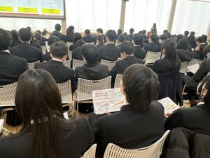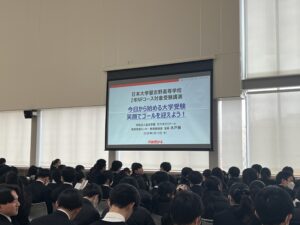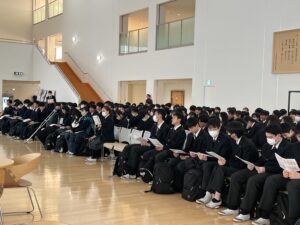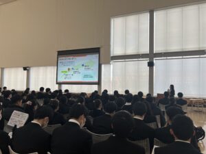 受験講演は、国公立大学を志望しているNPコースの生徒を対象に、受験に必要な情報を提供するために行われています。入試方式等の基本的な情報はもちろん、先月実施された共通テストの具体的な出題問題にも触れ、それに対する具体的な学習方法についてお話をいただきました。また、入試についてだけでなく、大学進学後の生活や、職業選択、広い視野での進路選択を考えることができる内容でした。