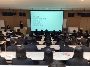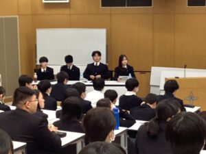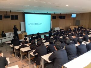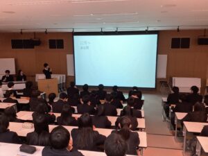 3月12日(木)、2年生の理系GAコースを対象に、視聴覚室において卒業生による受験講演を実施いたしました。理系GAコースを卒業した4名が来校し、自身の受験体験談を語ってくれました。