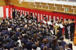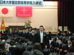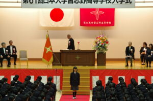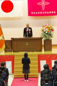 令和8年度第61回入学式が4月6日、本校体育館で挙行されました。雨の日が続いていましたが、当日は天候にも恵まれ、晴れやかな一日となりました。式典には、轟 朝幸 日本大学理工学部長をはじめとするご来賓各位、多数の保護者が出席して執り行われました。五味 好美 学校長は式辞の中で、新入生に向けて、高校生活では常に「学ぶ意味」を問い続けてほしいとエールを送りました。式典中の新入生の入退場や校歌斉唱などは吹奏楽部による生演奏で盛大に行われました。