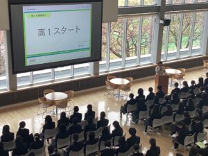 4月7日、入学式を終えた新1年生は、2日に分けて行われる新入生研修会で高校生活3年間をどのように過ごしていくかを学びます。1回目となる今日は、学校生活や学習について、また、学校生活の規則、今後の進路などについて各部署からの説明を聞きました。その後、校歌練習などを行い、各クラスでホームルームのあと、下校しました。昨日と比べると、話を聞いている最中にも、笑顔が見え、少しリラックスした様子が感じられました。