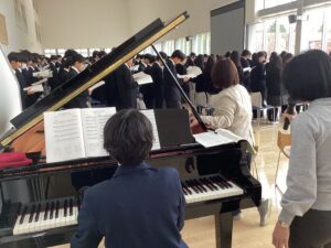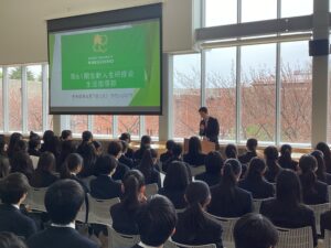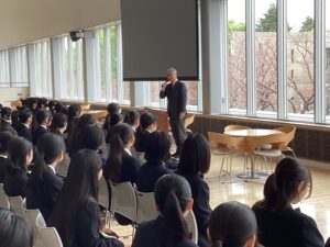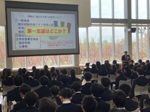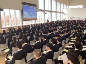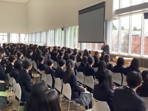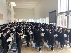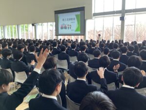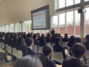 4月7日、入学式を終えた新1年生は、2日に分けて行われる新入生研修会で高校生活3年間をどのように過ごしていくかを学びます。1回目となる今日は、学校生活や学習について、また、学校生活の規則、今後の進路などについて各部署からの説明を聞きました。その後、校歌練習などを行い、各クラスでホームルームのあと、下校しました。昨日と比べると、話を聞いている最中にも、笑顔が見え、少しリラックスした様子が感じられました。