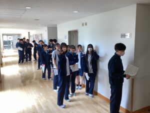 ちなみに体操着・上履きは、学年ごとに色分けがされており、1年生は緑、2年生は赤、3年生は青が襟元などに施されています。1年生は今日で4日目の登校ですが、校舎内のさまざまな場所で測定を行うため、自分の足で校舎を把握する良い機会になったのではないでしょうか。
