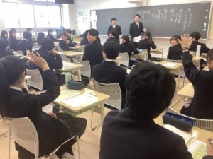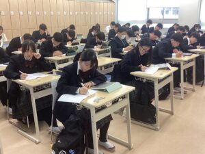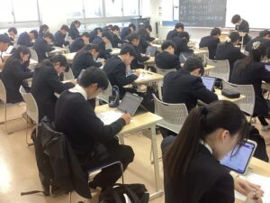 ちなみに2・3年生はスタディサプリ到達度テストを各教室で行いました。このテストは、生徒の基礎学力のつまずきを単元レベルで特定し、効率的に弱点克服を行うためのタブレットを利用したテストです。新学年の早い段階で苦手分野を重点的に学習できるよう毎年実施しています。