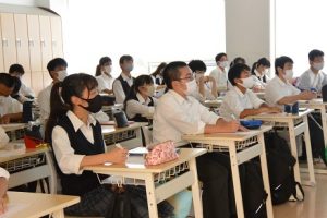 1年生を対象とした日本大学理工学部長講演(動画配信)が9月8日、ロングホームルームの時間に各教室で実施されました。1年生は,理工学部の学問や研究について真剣に耳を傾けていました。