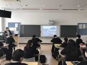 54期2学年CSTコースのMUプログラム「機械工学科」が11月11日,2年12組教室にて行われました。関谷先生から,機械工学科は「自動車」をはじめとしたものづくりの学科であること,そのためさまざまな分野において,必要とされる技術や知識が習得できることを学びました。大学へ入ってからは製図や工作実習などの授業があり,厳しいことを要求されますが,その分企業などからは引く手数多の学科であるということでした。MUプログラムも終盤に入り,生徒は学科選択について真剣に考えていました。