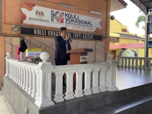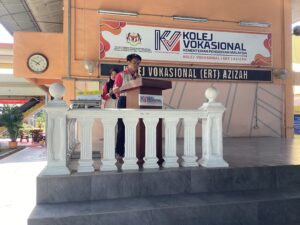 午前中は、シンガポールからマレーシアへ入国し、現地校であるKolej Vokasional Azizahを訪問しました。到着後、学校交流が行われ、はじめにKolej Vokasional Azizahの校長先生と現地代表の先生より心温まる歓迎の挨拶をいただきました。続いて、本校の学年主任より現地校に向けての挨拶があり、両校の交流への期待について英語で挨拶を行いました。